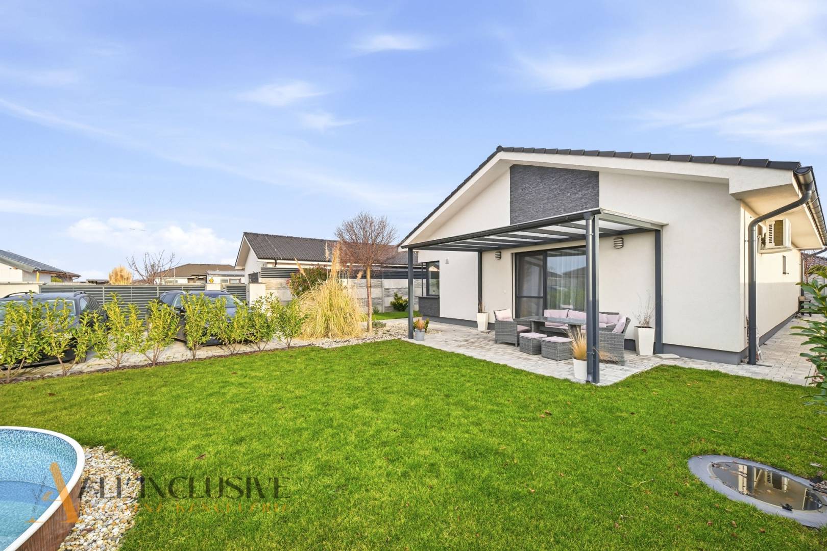 Nachádza sa tu bazén, ktorý poskytuje príjemné osvieženie počas horúcich letných dní a vytvára dokonalú atmosféru domácej dovolenky. Priestranná prestrešená terasa je ideálnym miestom na rannú kávu, večerné posedenia či víkendové grilovanie.